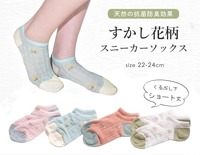 - □新品 靴下 すかし 花柄 レディース スニーカー アンクル ソックス 4色 セット かわいい ガーリー