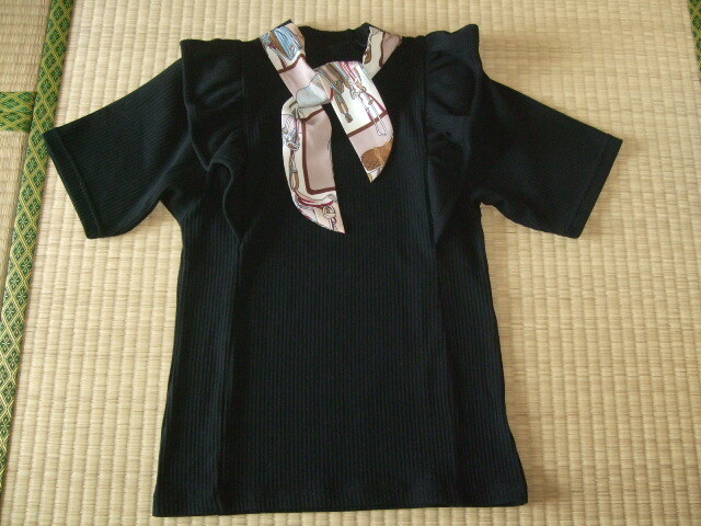 - 美品 LEAHMATIM フリルとリボン結びがおしゃれなカットソー 黒色 L