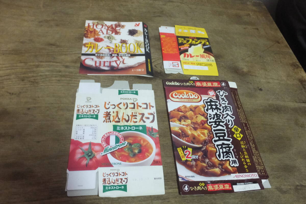 > ★ て-940 空箱 4個 1998~2006年前後 パッケージ 中身なし カレーBOOK ミネストローネ チーズフォンデュ マーボー豆腐 縦22cm 幅15cm