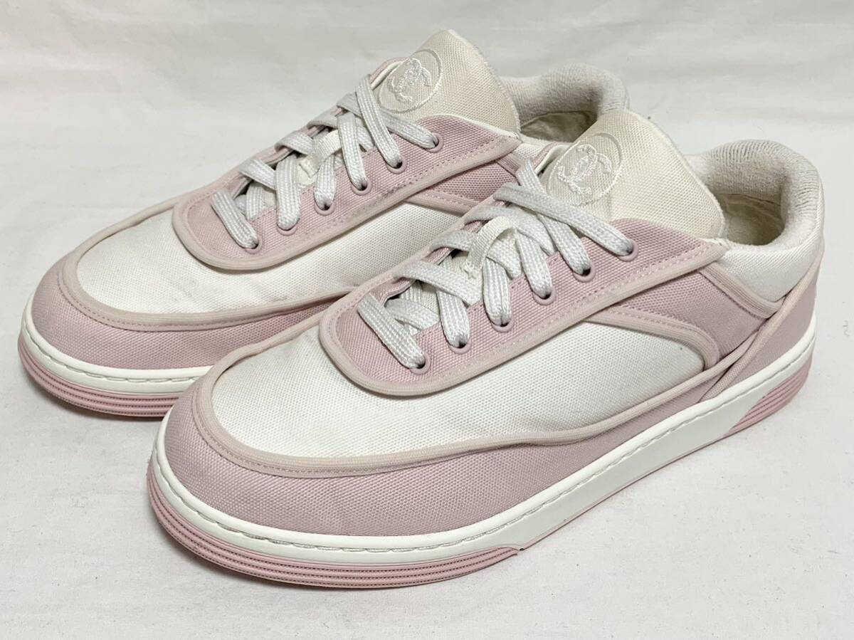 > 希少 超美品 シャネル CHANEL G37488 ココマーク刺繍 ヒールラベル CC キャンバス系 ホワイト ピンク バイカラー スニーカー 36 22.5~23cm