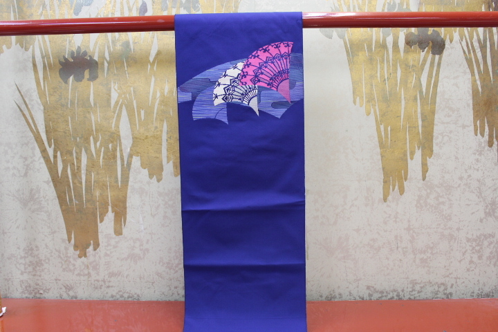> きもの今昔7345 名古屋帯 西陣織片緞子地 御太鼓と前腹に柄 紺色地飾り扇デザイン