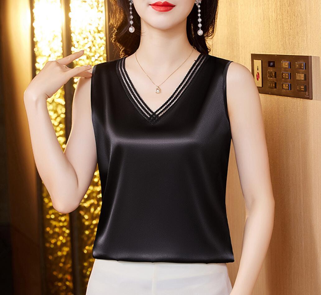 - 新品 人気推薦 /上品 光沢感 トップス ノースリーブ シャツブラウス 薄手 Vネック 着痩せ サテンブラウス オフィス通勤 大人 /ブラック