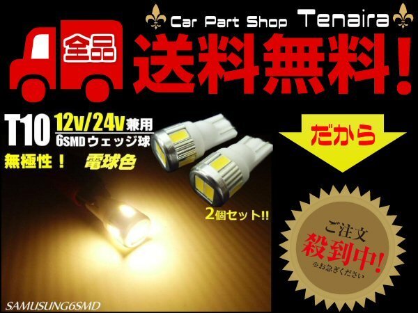 > 12V 24V 兼用 T10 電球色 LED 2個 ウェッジ 6SMD バルブ ナンバー灯 スモール ポジション球 ウォームホワイト 暖色 メール便送料無料/7