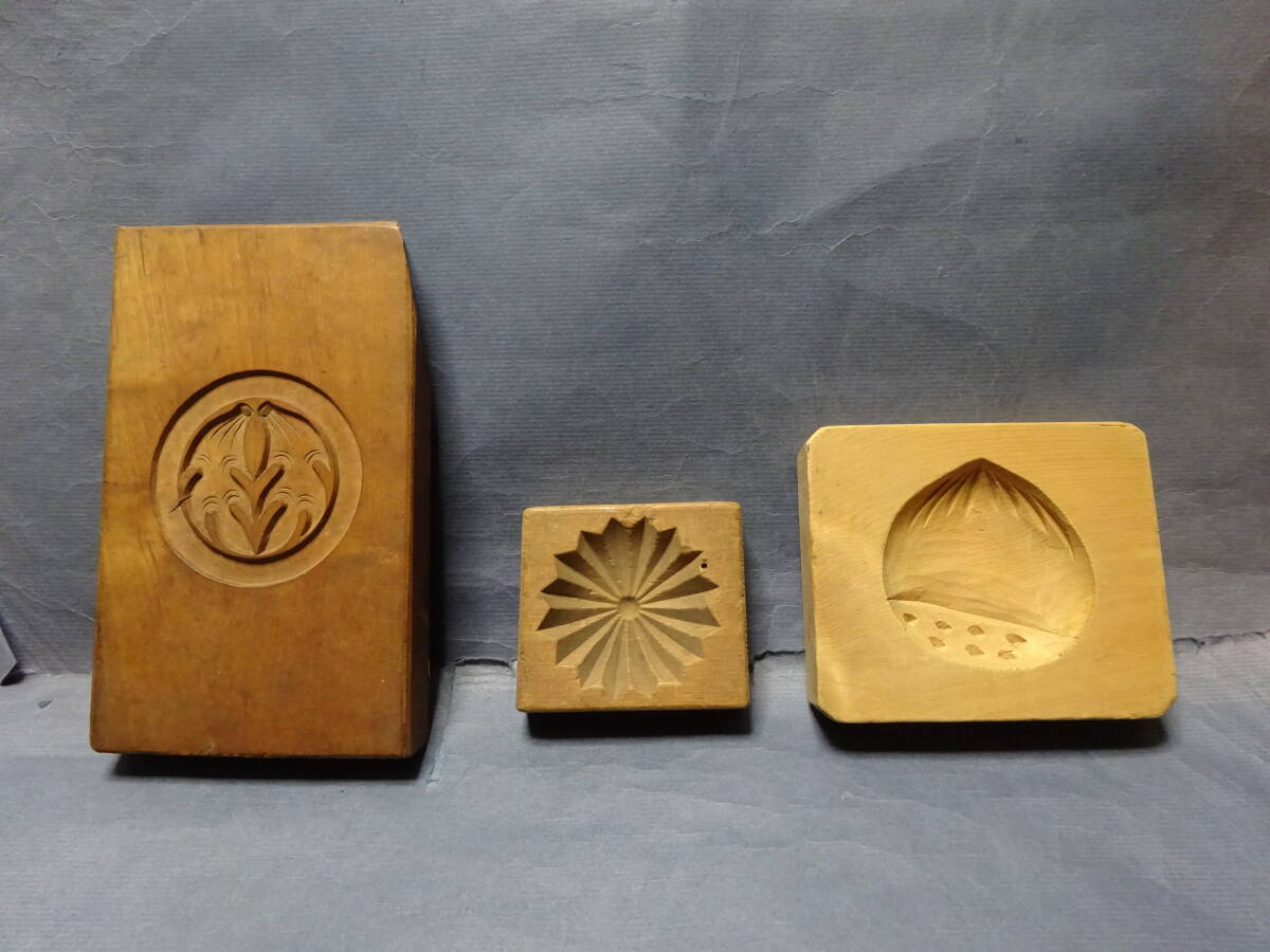 - (9−6)栗、家紋、菊花等 計3個 菓子型 木製 彫刻 木彫 和菓子木型 古民具民藝 民芸 落雁 時代