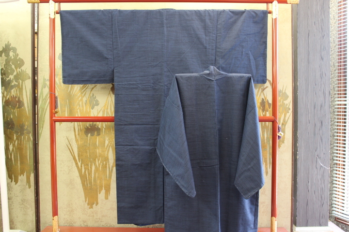 - きもの今昔7414 男の和服 紬のアンサンブル 横に節糸ブルーグレー色 仕立シツケ糸付未使用品 美品 きもの丈140CM