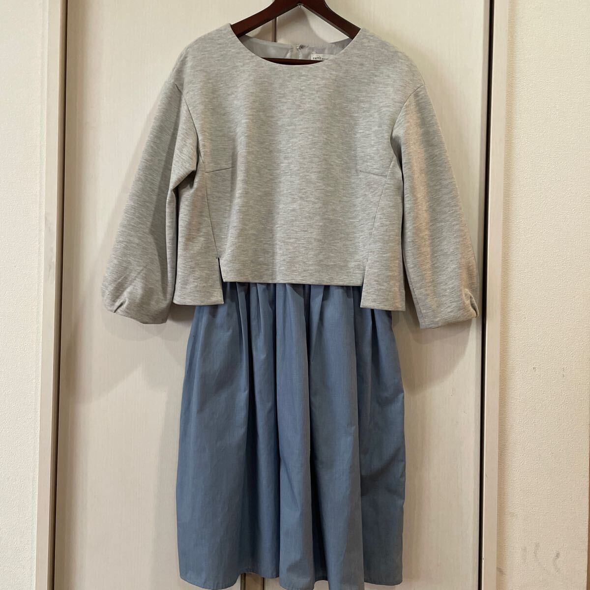 - 送料無料 新品同様 earth music&ecology アースミュージック&エコロジー 七分袖ふんわり袖ワンピース サイズM グレー×水色 送料込み