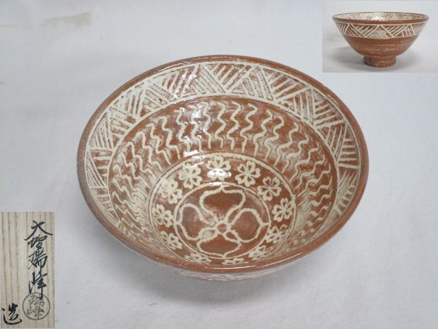 > 雉坂★茶道具【 萩焼 三嶋茶碗 大野瑞峰 共箱 】★抹茶碗・茶碗・彫三島・三島暦・共布