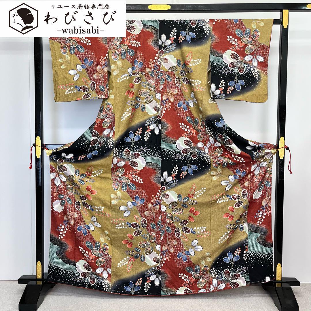 楊梅色ベースのお色味に金銀彩が使われた流水に萩の花模様がデザインされた素敵な柄裄のお品でございます。