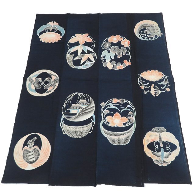 - 藍染 筒描き 筒描 筒書き つつがき 鶴 亀 蝶 草花 古裂 時代布 襤褸 古布 アンティーク リメイク きもの北條 A1051-9