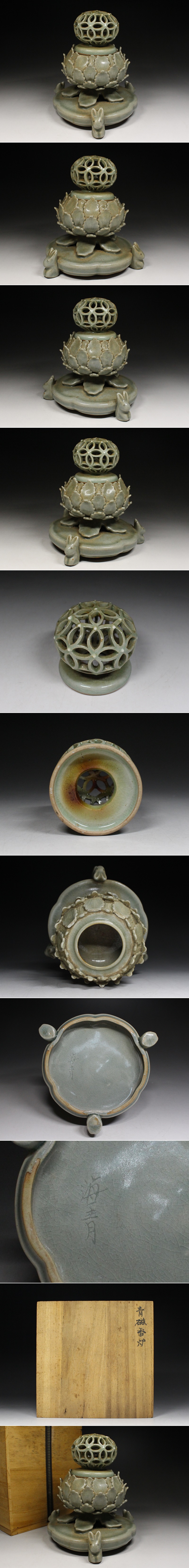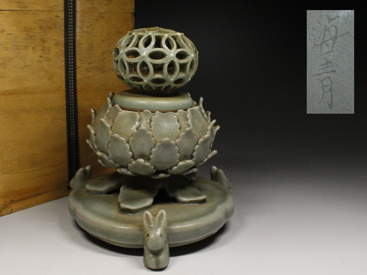 > ■中国古玩■海青・香炉・うさぎ脚・三脚香炉・透かし蓋・陶磁器・香道具・茶道具・飾り物・置物・縁起物・箱付・f3155h