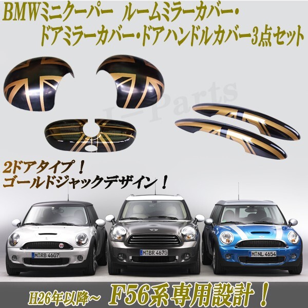 ●ミニクーパーF56系2ドア車専用ルームミラー&ドアミラー&ドアハンドルカバーゴールドジャックデザイン3点セット!