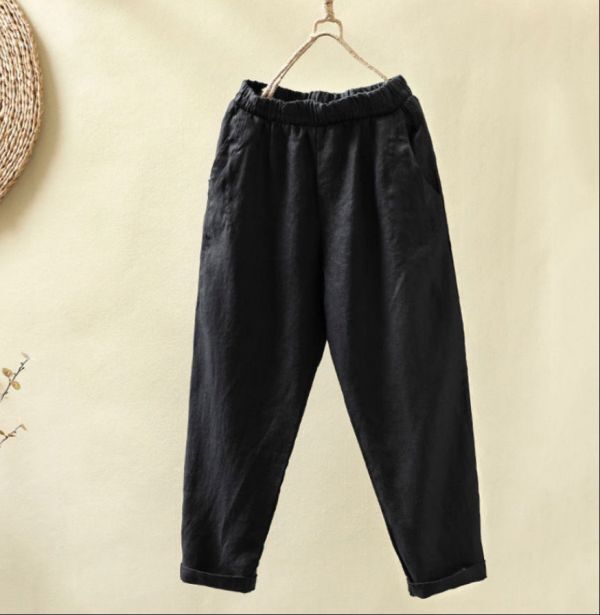 - 秋新品*人気 パンツ ボトムス ゆったり 無地 お仕事パンツ 綿麻 通勤 ワイドパンツ 30代 40代 ウエストゴム リネンパンツ*ブラック