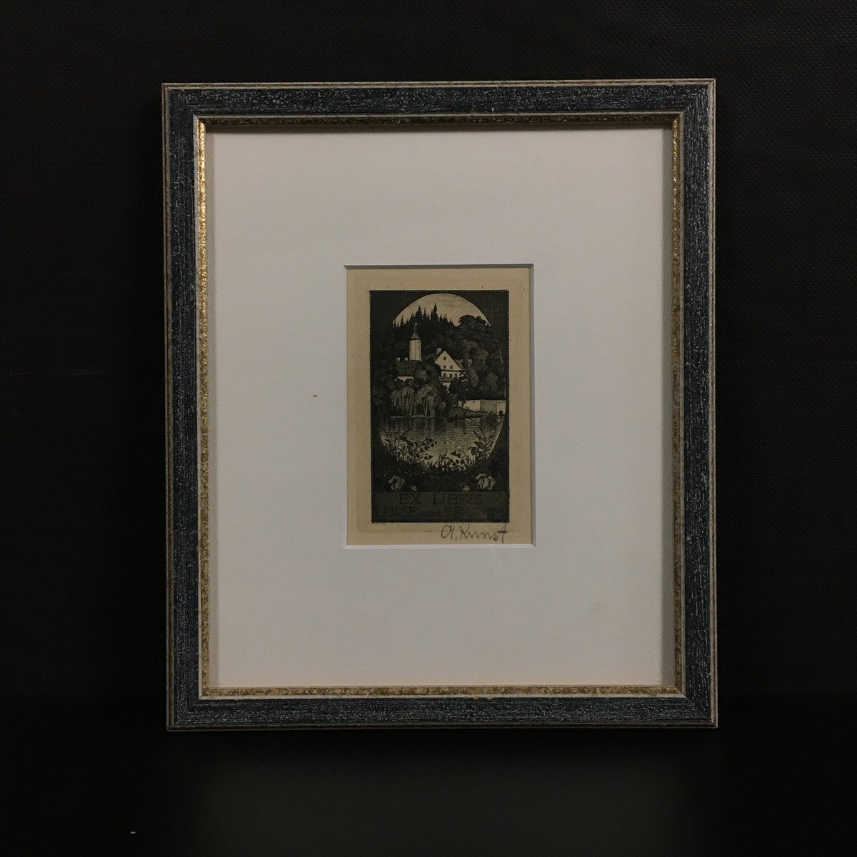 > 銅版画 蔵書票 額付き a.kunst 直筆サイン サイズ:25x30x1.5㎝ 湖 家 風景画 アンティーク インテリア