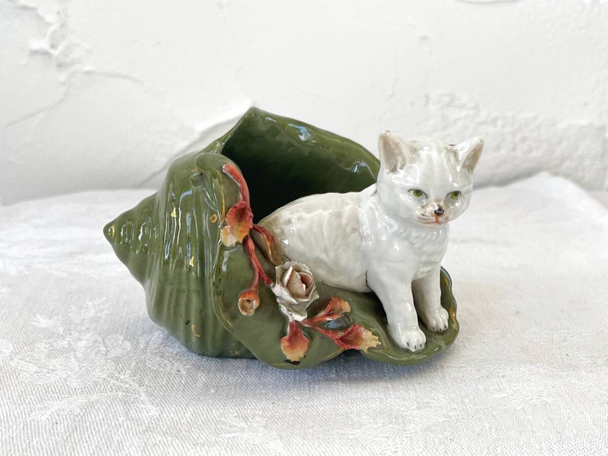 - フランス アンティーク 白猫 ネコ 陶器 貝殻