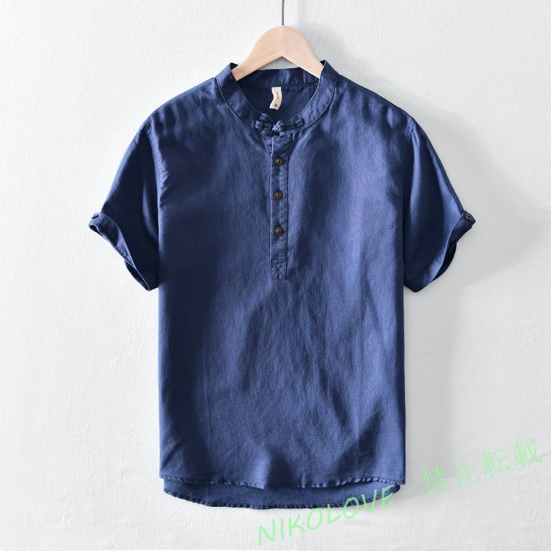 - 新品 半袖シャツ リネンシャツ 綿麻混 プルオーバーシャツ 夏服 カジュアルシャツ サマーシャツ トップス 紺 LG005