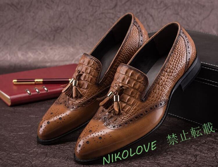 > 新品 ビジネスシューズ 鰐柄 最高級 本革レザーシューズ 職人手作り 彫り フリンジ 牛革 紳士靴 ドレス 結婚式 革靴 ダークブラウンLF849