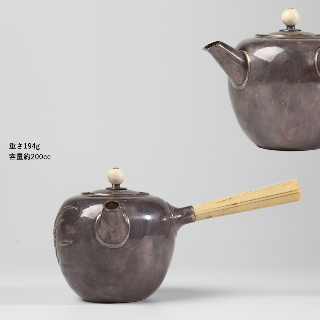 - 古銀 茶壺 「純銀鏨刻高レリーフ洞石蘭花霊芝紋側把銀壺」 銀瓶 珍材鈕 煎茶 湯沸 急須 茶道具 南鐐 金工 茶器 時代物 LT-240941