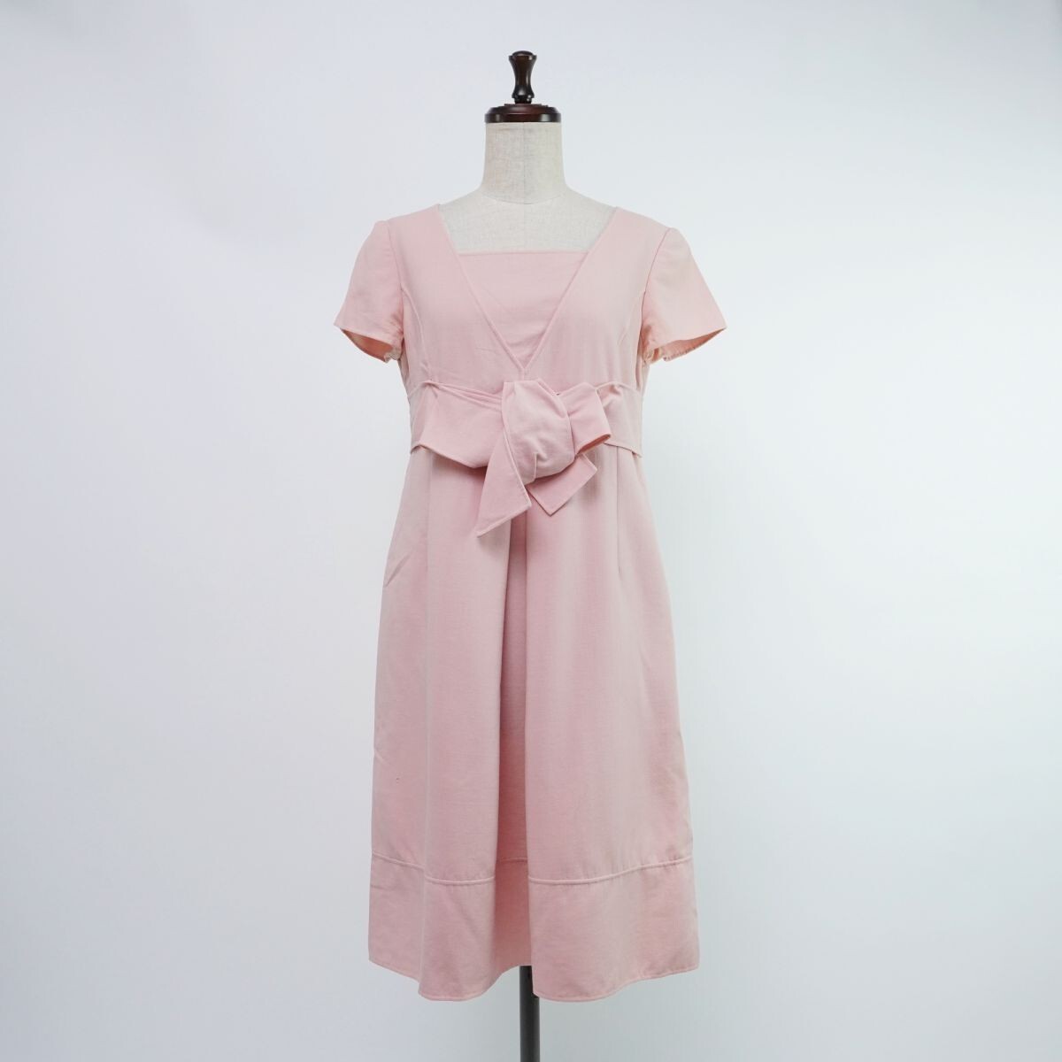 - FOXEY フォクシー ウール混 リボンデザインフレアワンピース バックジップ 膝丈 裏地無し レディース ピンク サイズ38*TC719