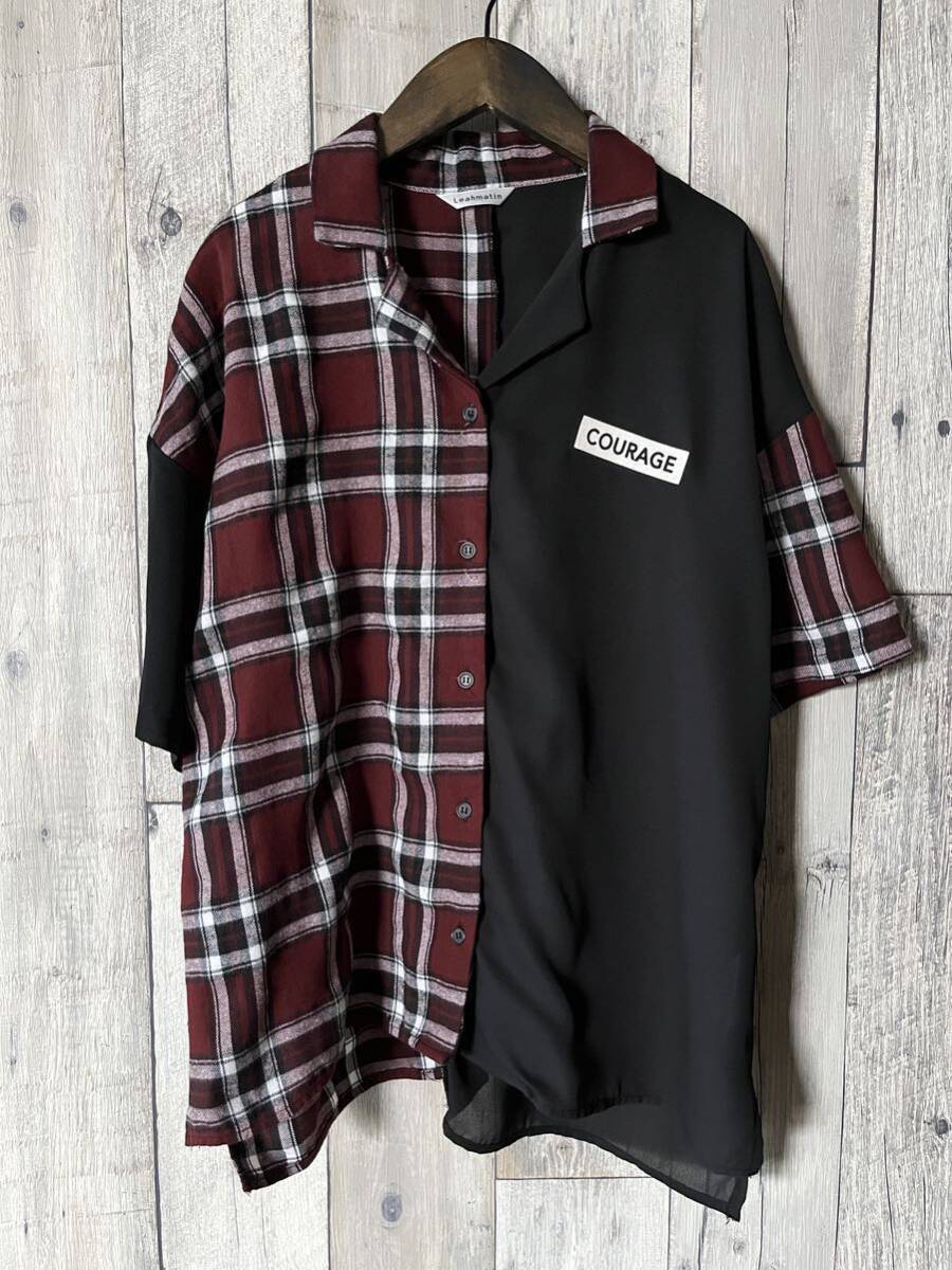 > ■オシャレ■ オープンカラーシャツ 切り替え 半袖シャツ 異素材 ドッキング チェック COURAGE Leahmatin 開襟