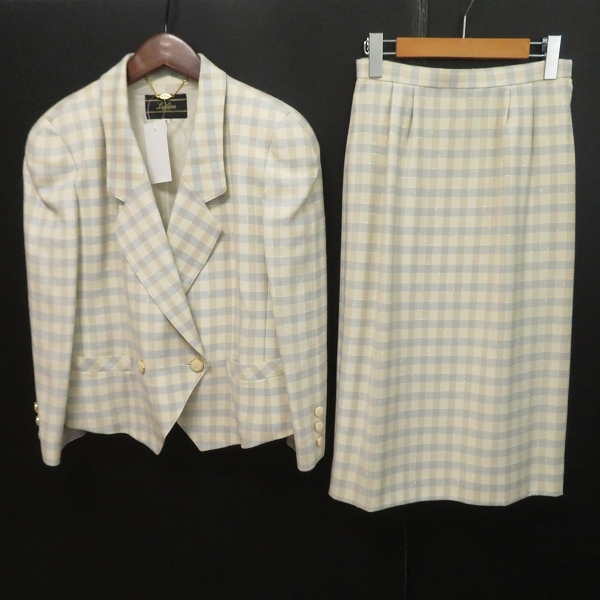 > #anc レリアン Leilian スカートスーツ セットアップ 9 ベージュ 水色 チェック ダブル イタリア製生地 レディース [905183]