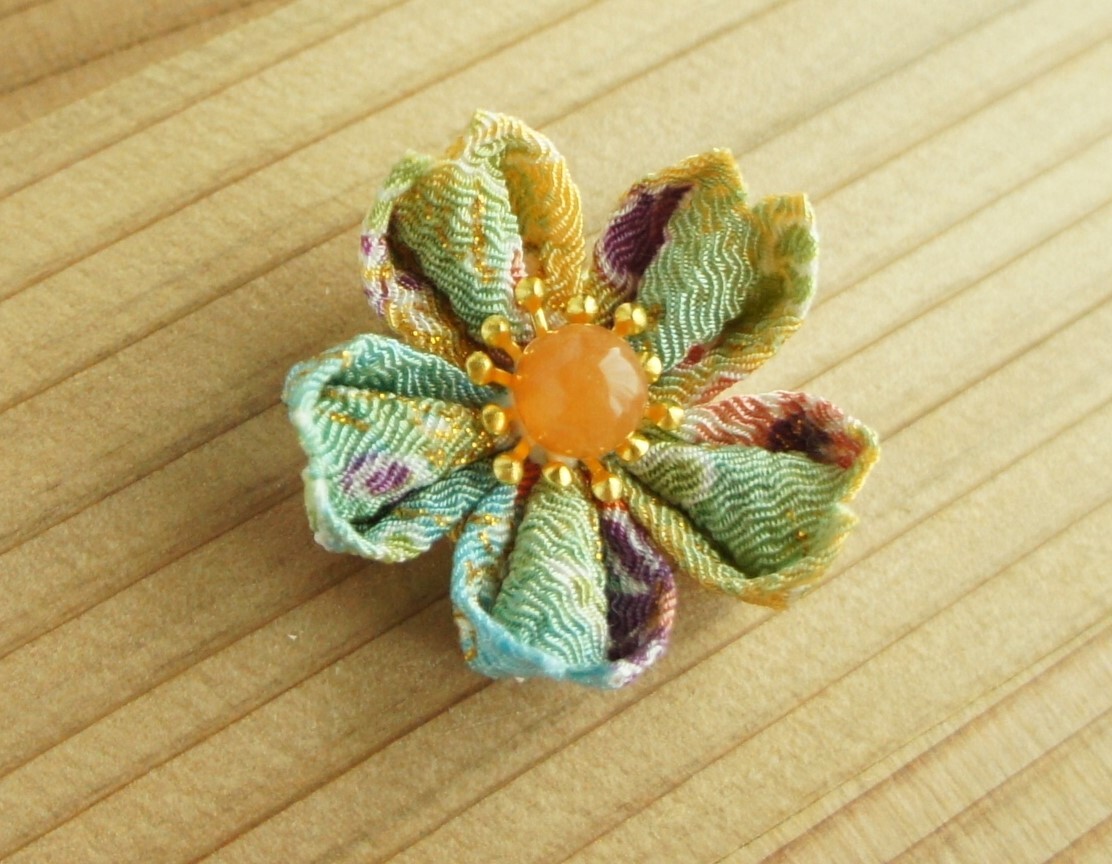 - ♪ ハンドメイド ブローチ お花 つまみ細工 ちりめん金彩 天然石 レッドアヴェンチュリン