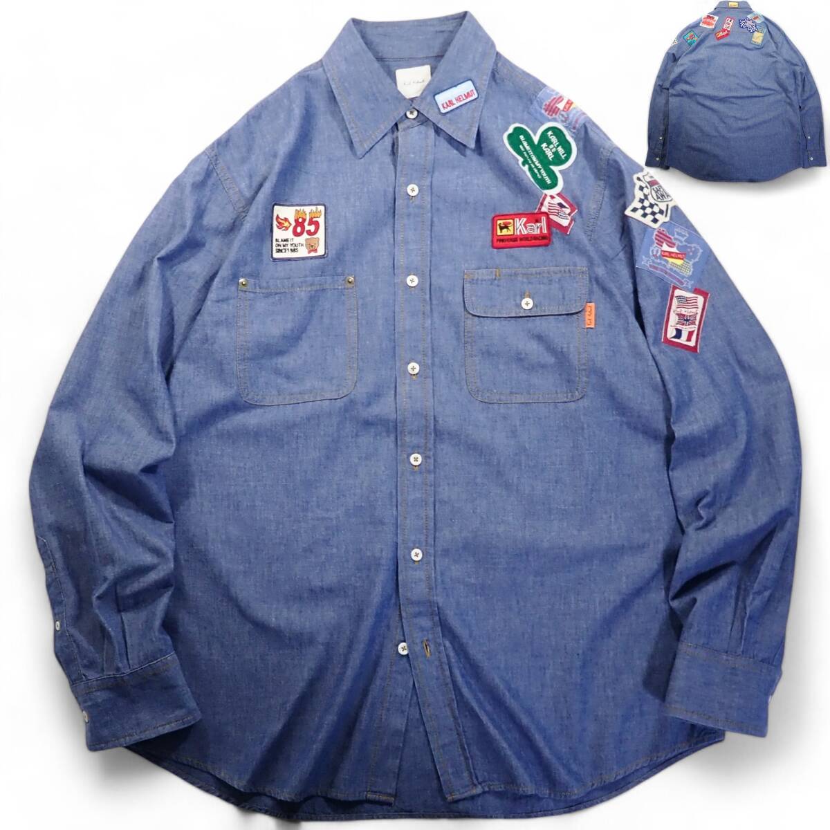 > 5112/美品 Karl Helmut ロゴワッペン 長袖シャツ L●シャンブレーPINKHOUSE WORLD RACING 熊 カールヘルム●洗濯プレス済 ネコポス可●古着