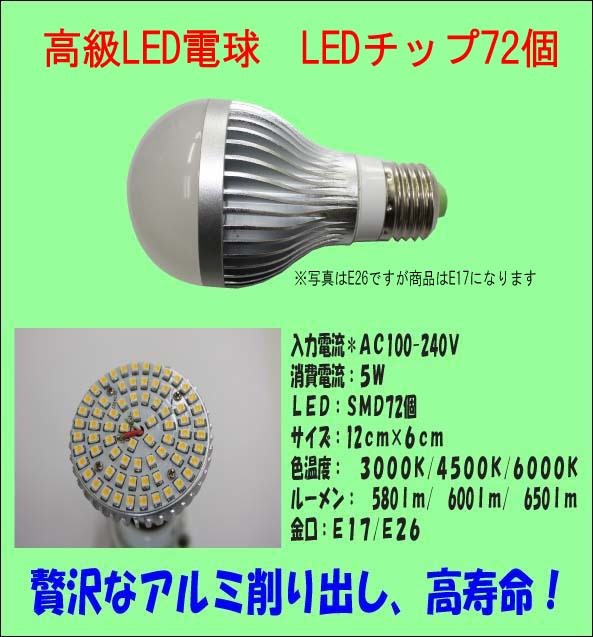 > LED電球 高級アルミ削りだし 5W LEDチップ72個 60~80W相当 E17 4500K(ナチュラル白色)