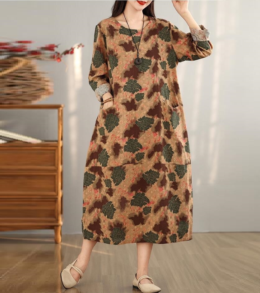 - 秋新品*ワンピース 40代50代 きれいめ プリント柄 綿麻 ロングワンピース 大きいサイズ 長袖 30代 大人気 カジュアル 着痩せ 通勤*コーヒー
