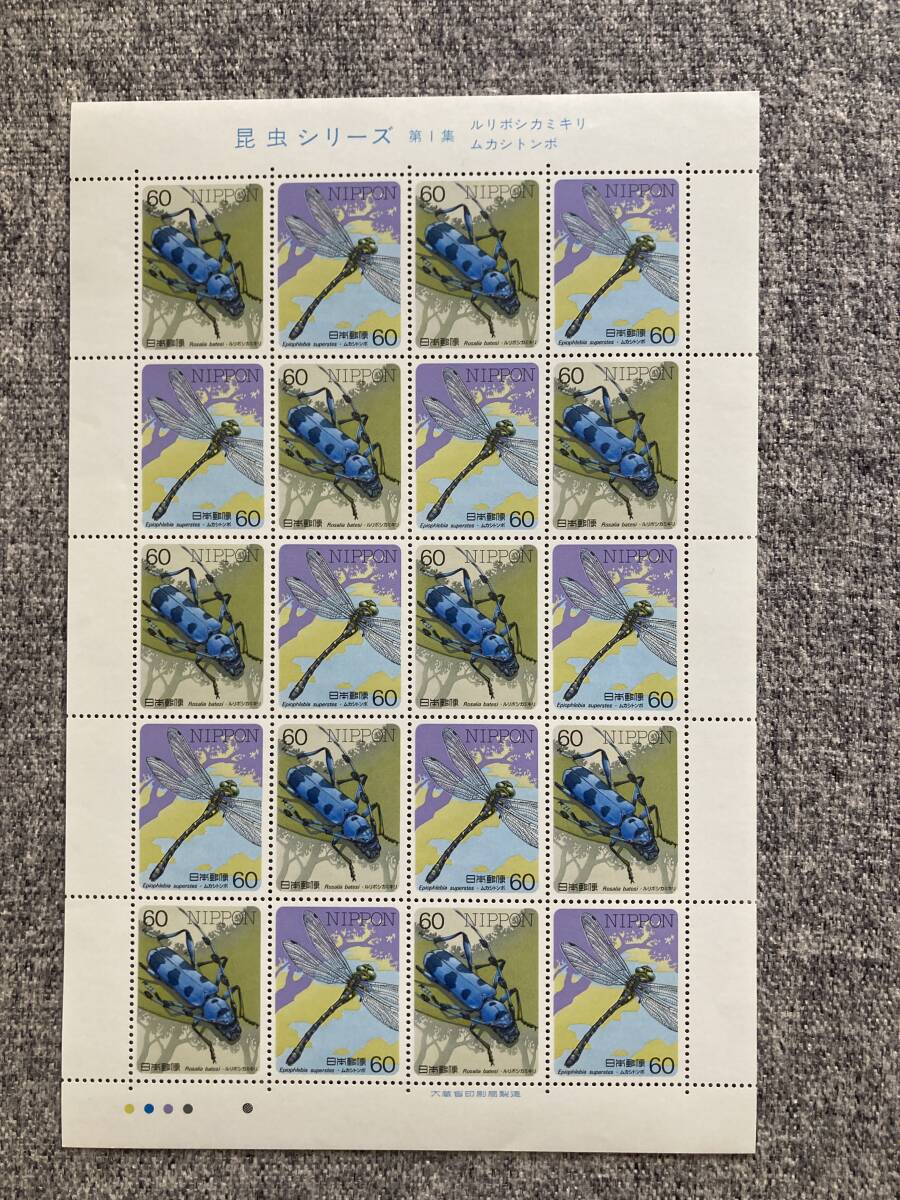- ★未使用 昆虫シリーズ 第1集 ルイボシカミキリ ムカシトンボ カミキリムシ トンボ 1986年 昭和61年 2種連刷 切手シート 60円20枚 日本郵便