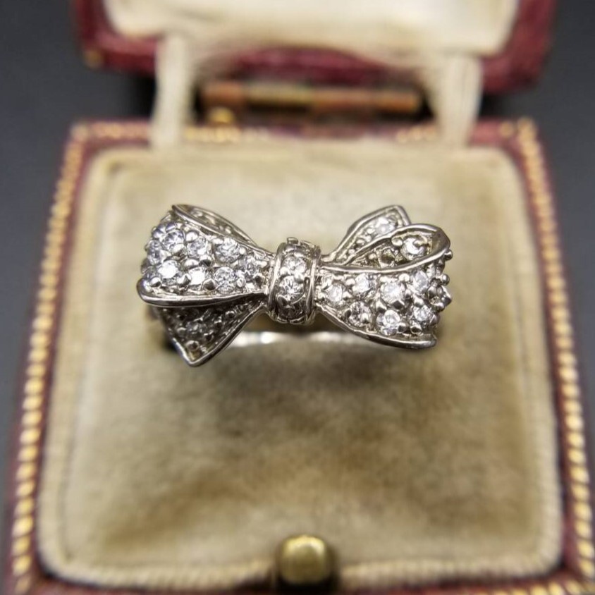 > 立体リボン クラシック キュービクルジルコニア装飾 ヴィンテージ リング シルバートーン 指輪 エレガント コスチュームジュエリー Y18-Y