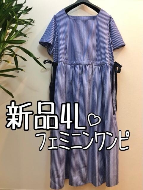 - 新品☆4L♪紺系×ストライプ♪サイドリボンかわいいフェミニンワンピ☆b433