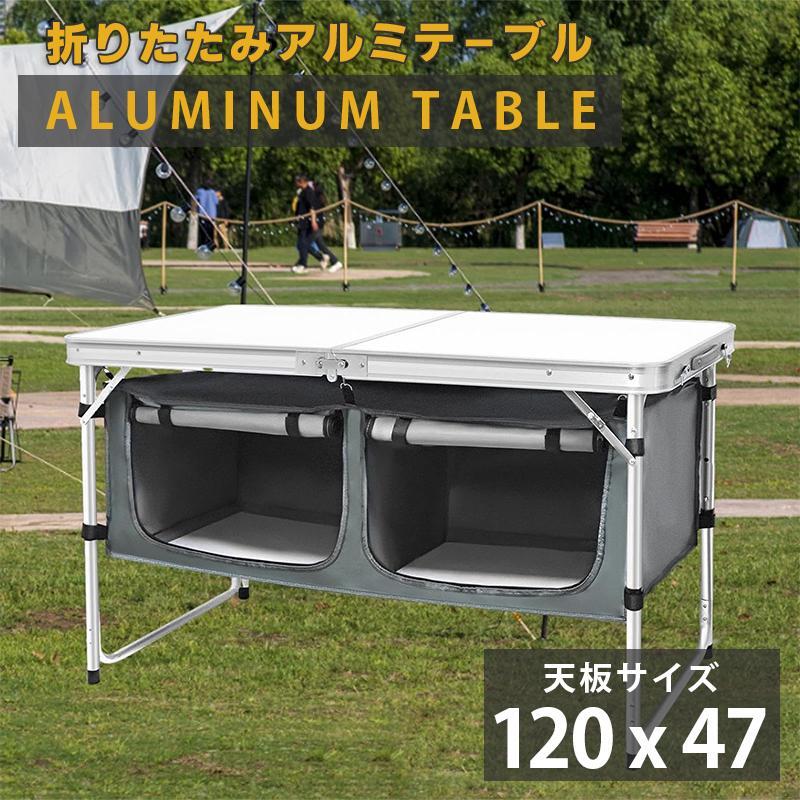 - 期間限定-最新版アウトドアテーブル 折りたたみ 120cm 収納付き 高さ3段階調節 防水 ローテーブル アルミ レジャーテーブル 庭キャンプ