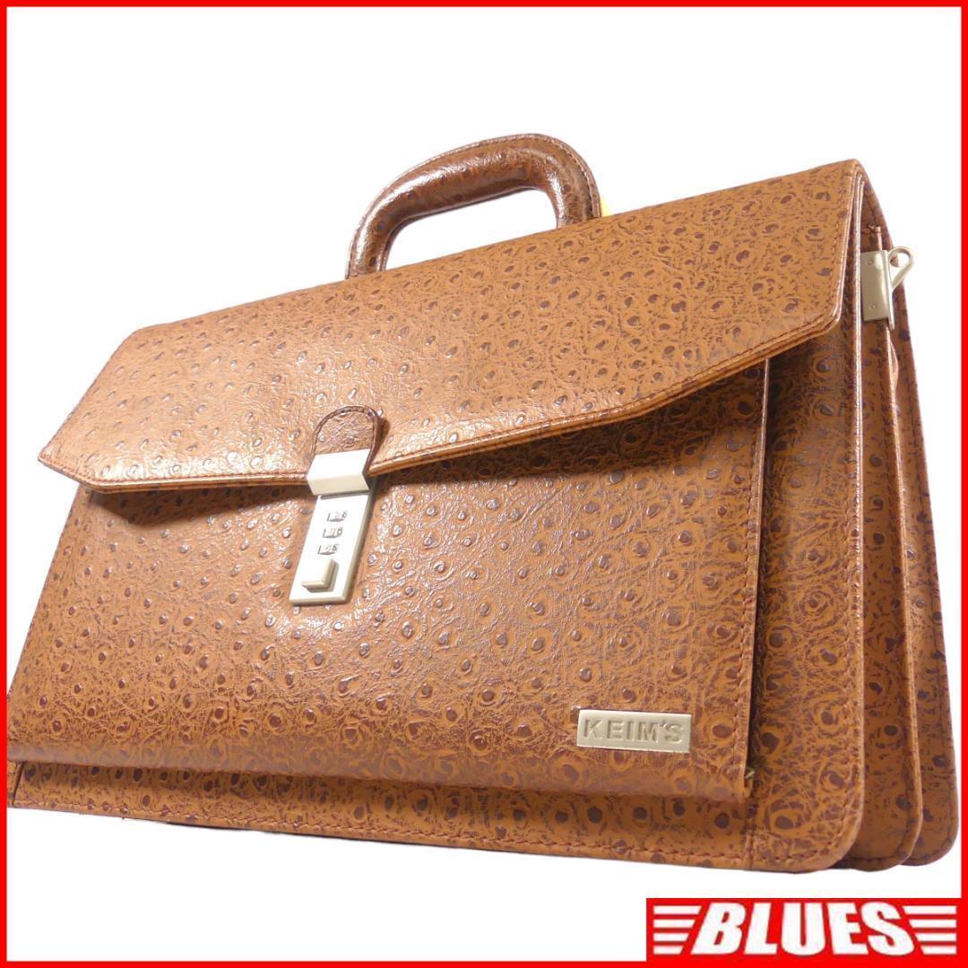 - 即決★KEIM’S★オールレザービジネスバッグ ケイムス メンズ 茶 オーストリッチ型押し 本革 ブリーフケース 本皮 通勤 鍵付 出張