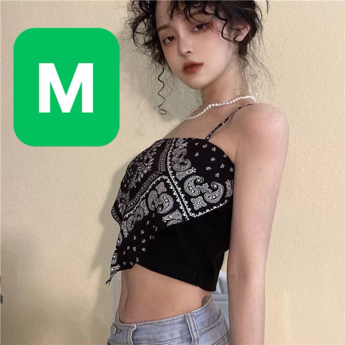 > キャミソール ペイズリー柄 トップス ショート丈 トレンド ストリート 人気 バンダナ風 インナー レディース ショート キュート 黒 M