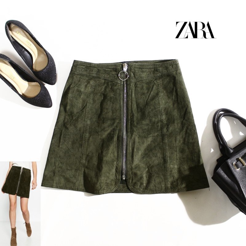 > ZARA woman ザラ ウーマン 本革 シンプル 秋 冬 台形 スエード レザースカート XS グリーン 緑 カーキ ピッグレザー