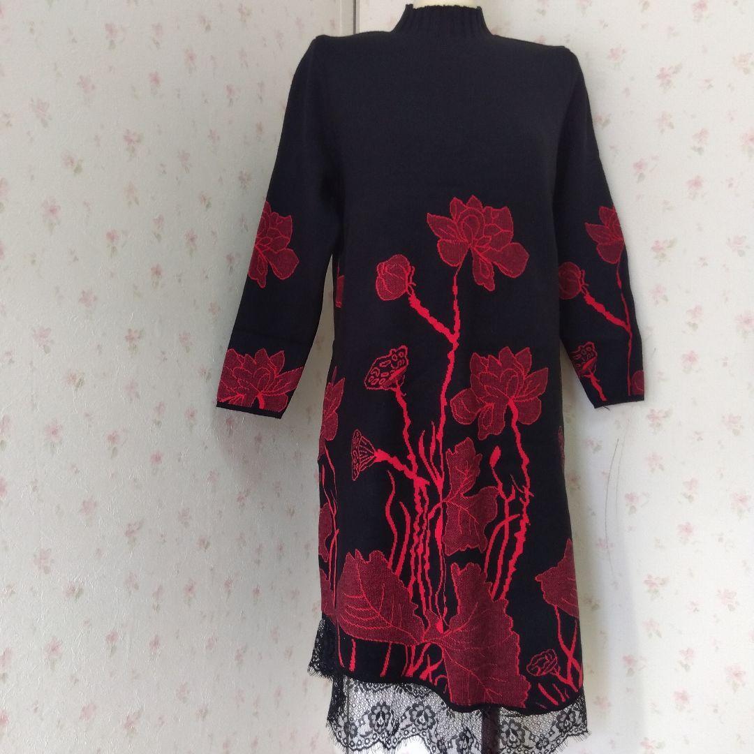- ブラック花柄★Lサイズ 長袖ひざ丈 ニットワンピースおしゃれ