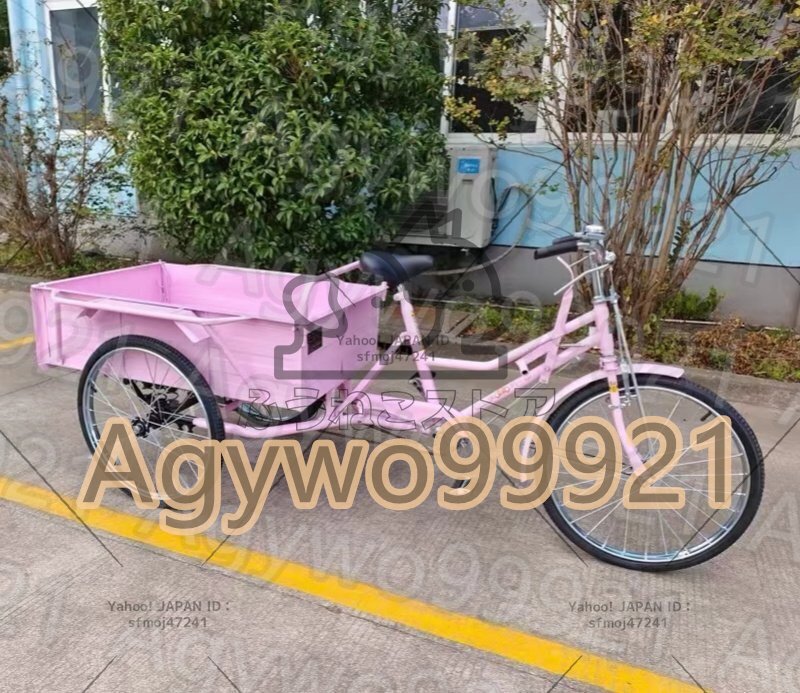 - 特売★品質保証 三輪自転車 大人用貨物三輪車 24インチ 載荷重150kg ダブルブレーキ 三輪車 大容量 貨物バスケット後カゴ付 ピンク