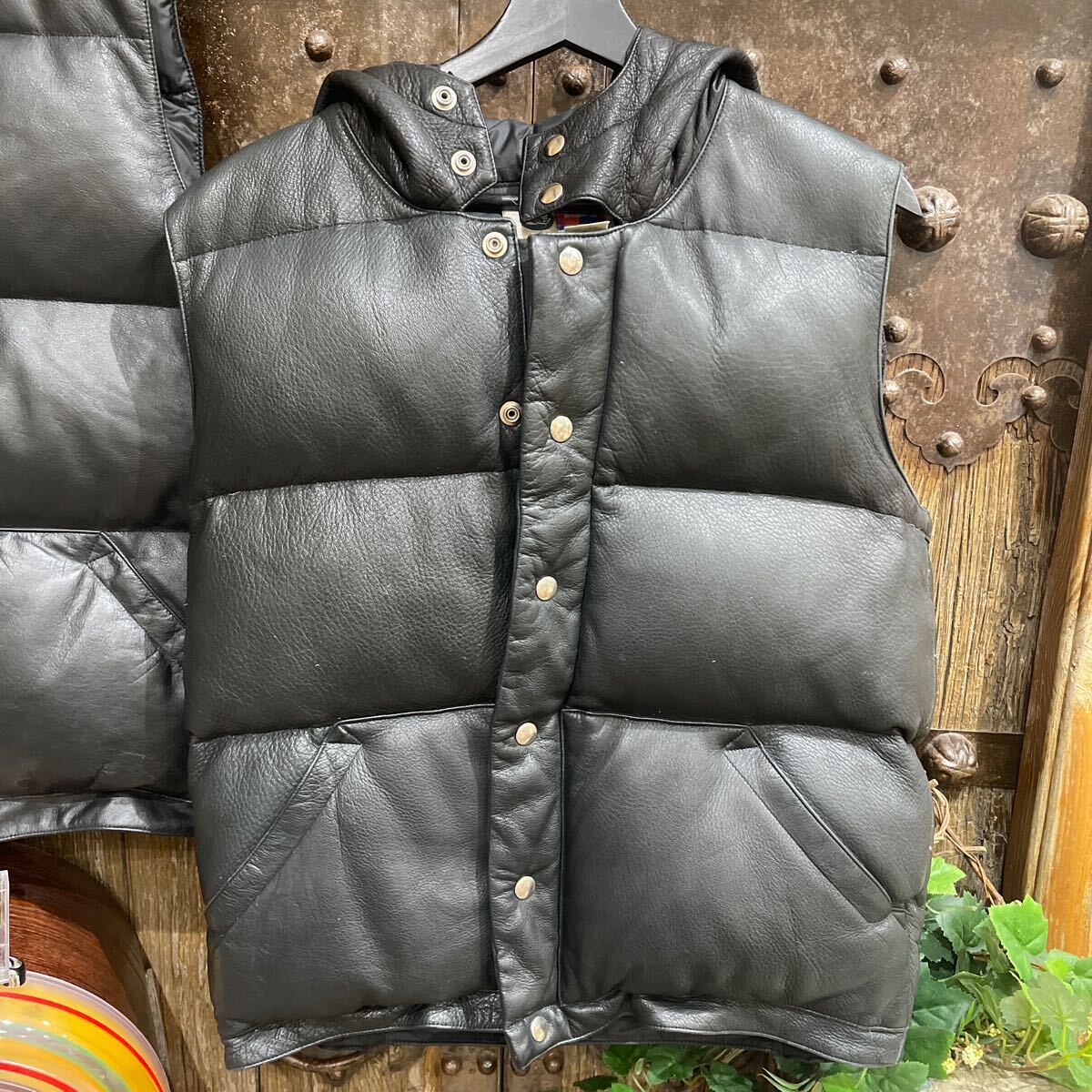 > Y1008. 2. USA製 Crescent Down Works レザーダウンベスト フード付き ブラック 革. サイズ S 【着丈 約62】 【身幅 約54】 【肩幅 約45】