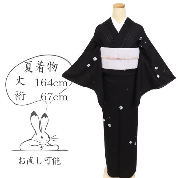 - 【小紋】 長尺 夏着物 小紋 網代模様 紋紗織 モノトーン花模様 黒 正絹 KB6-23