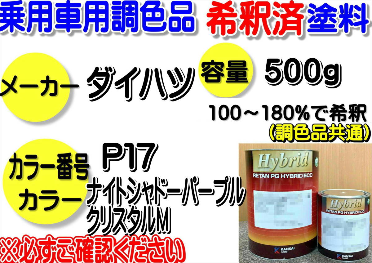 > (在庫あり)ハイブリッド塗料 計量調合品 ダイハツ P17 ナイトシャドーパープルクリスタルM 500g 調色品 小分け 希釈済み 全国送料無料
