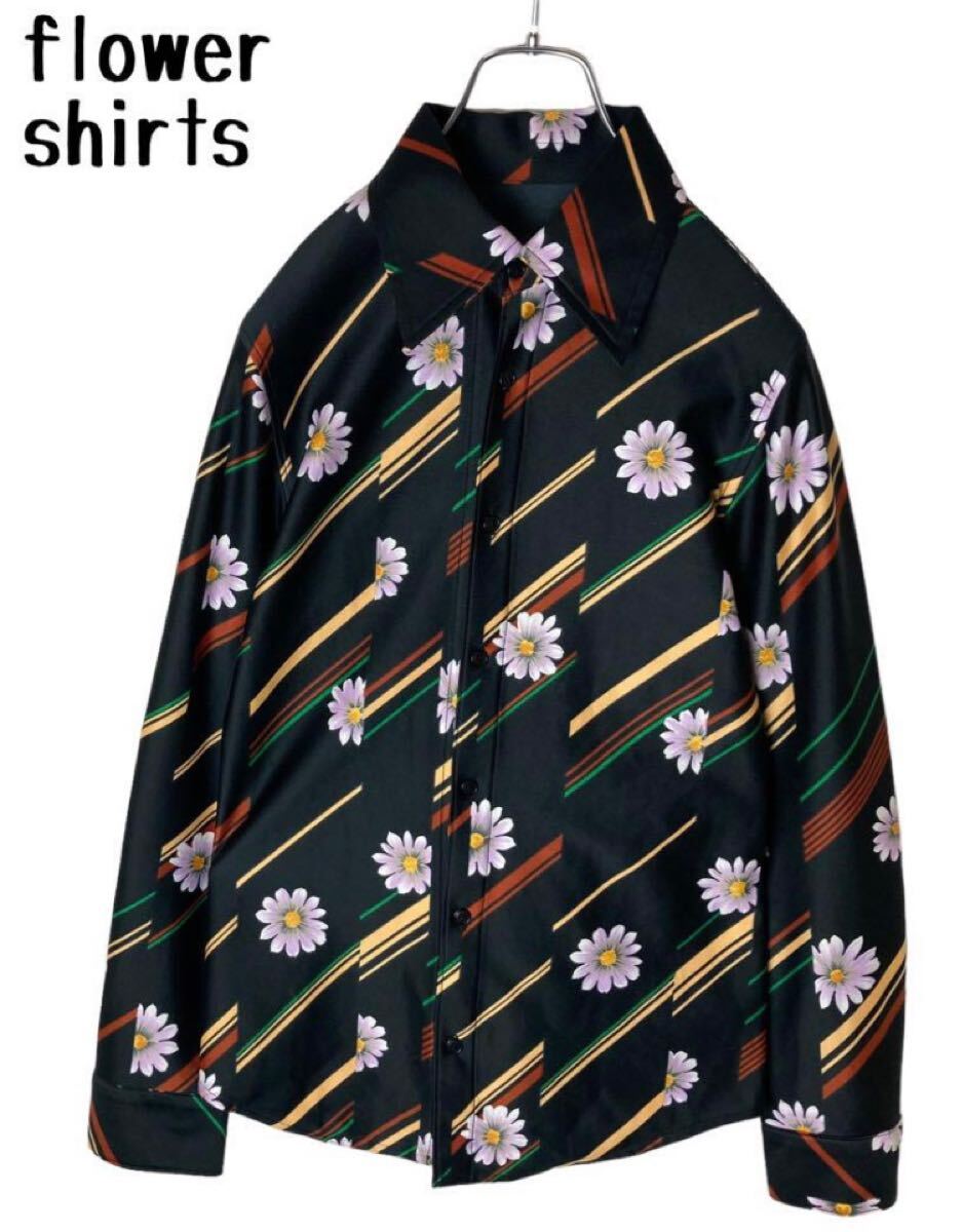 - グッドデザイン!レトロ古着 日本製 花柄ナナメボーダー総柄ブラックシャツ