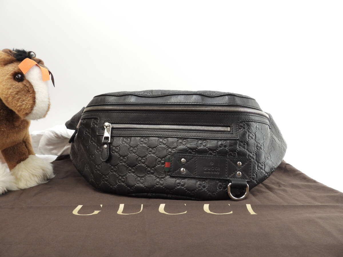 - グッチ ボディバッグ大 GG シマレザー黒 斜掛ショルダーバッグ ウエストバッグ 美品@ 21