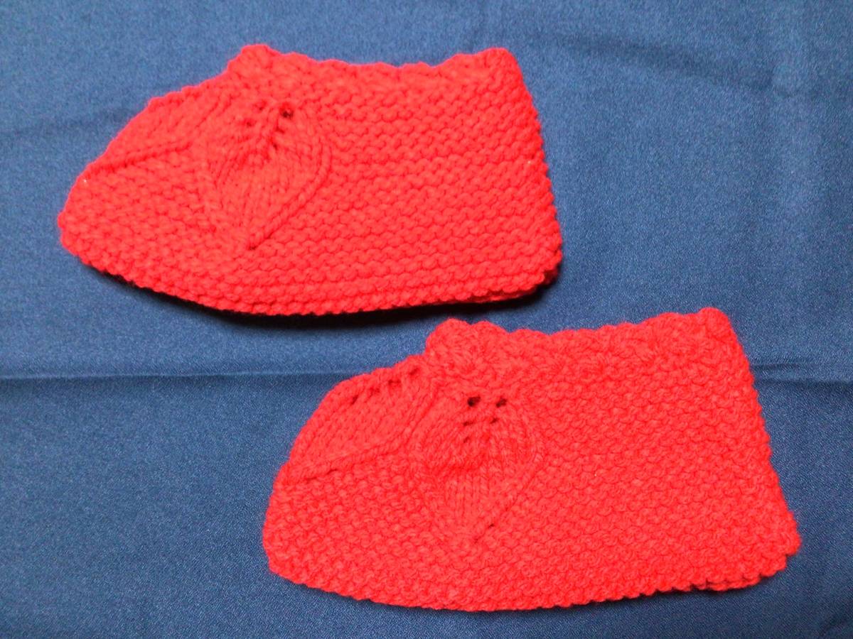 - 【編1】手編みルームシューズ(チェリーレッド) ハンドメイド 毛糸 ルームソックス 靴下カバー フットカバー 部屋履き 室内履き