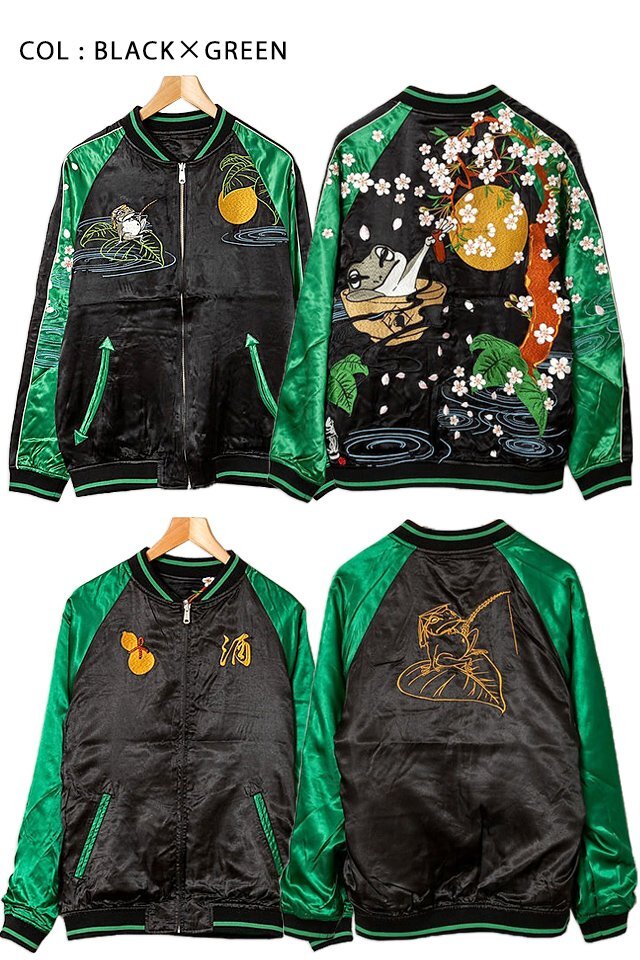 > 親父蛙ベロベロスカジャン◆参丸一 ブラック×グリーンMサイズ SM-30617 和柄 和風 刺繍 カエル スーベニアジャケット