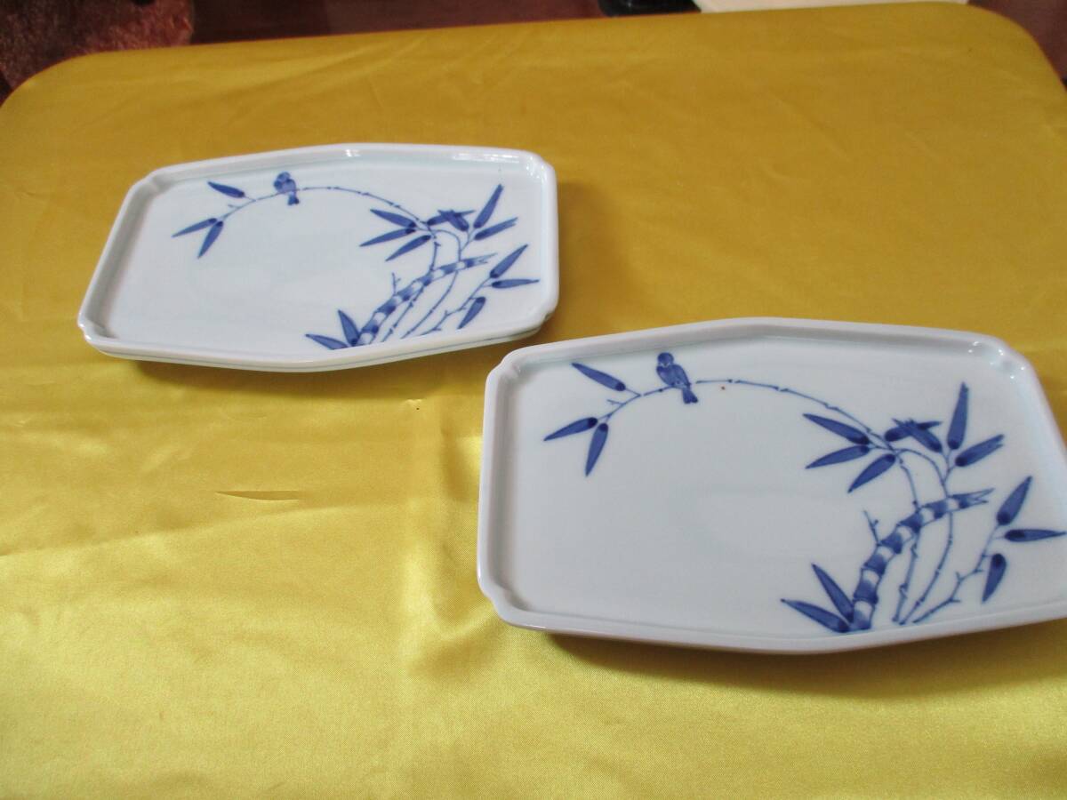 - 深川製磁 希少!笹雀絵 染付六角皿2枚 横21Cm 縦14Cm 高さ2Cm