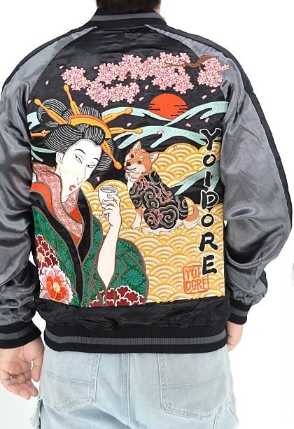 - 舞妓と犬 浮世絵スカジャン◆YOIDORE ブラック×グレーXLサイズ XL(メガジョッキ) 834101 ヨイドレ 酔いどれ 刺繍 和柄 和風 リバーシブル