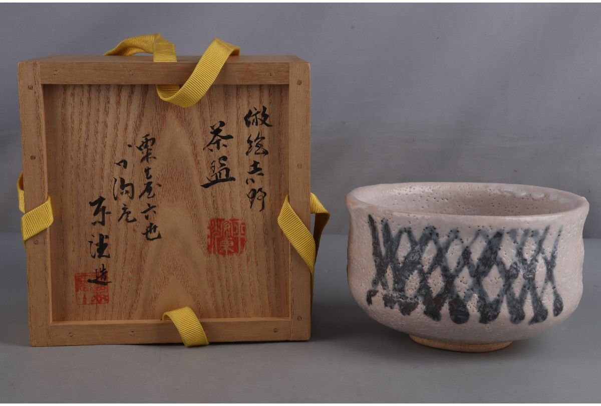 - [ギャラ藤]真作保証/粟生屋六世加陽庵 中村東洸 造「倣絵志野茶碗」/共箱/B-608(検)骨董/茶器/茶碗/急須/茶托/置物/茶道具/割烹/抹茶碗