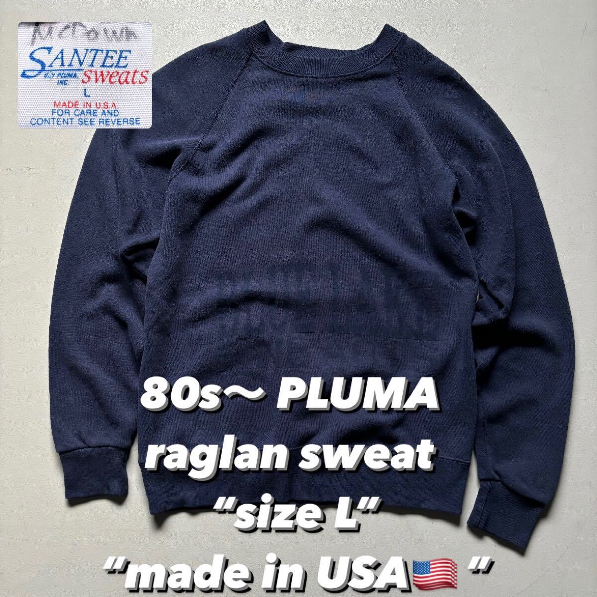 > 80s〜 PLUMA raglan sweat “size L” “made in USA”80年代 プルマ ラグランスウェット 紺 ネイビー 同色プリント アメリカ製 USA製