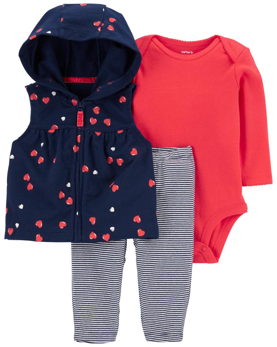 > 新品 3点セット 12M ★ carter's カーターズ ガールズ フード付き ベスト 長袖 ロンパース ロングパンツ 80 70 上下 セットアップ ハート柄