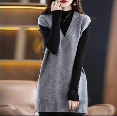 > ☆新品お色選択可秋冬 ニットベスト ニットセーター レディースチョッキ Vネック ロング丈 ニットトップス 袖なし 無地 可愛い 灰F